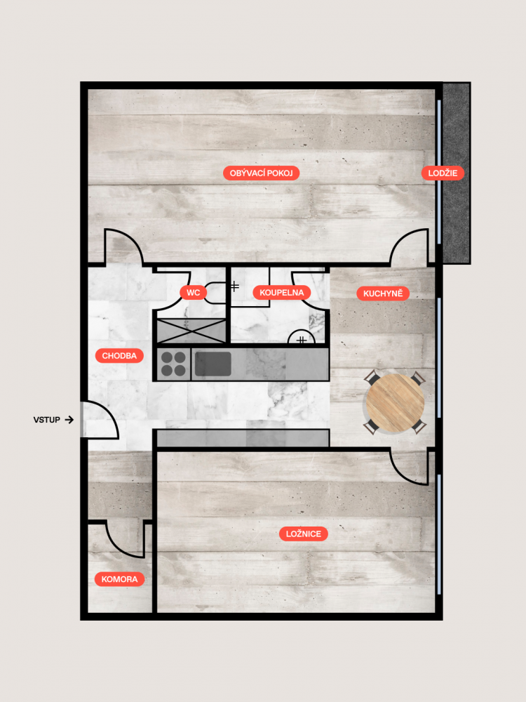 Dispozice bytu: podélná vstupní chodba, kuchyně, dva obytné (neprůchozí) pokoje - jeden se vstupem na zasklenou lodžii, koupelna, samostatná toaleta, komora. K bytu náleží také sklep, situovaný v přízemí domu, kde je k dispozici také kolárna.
